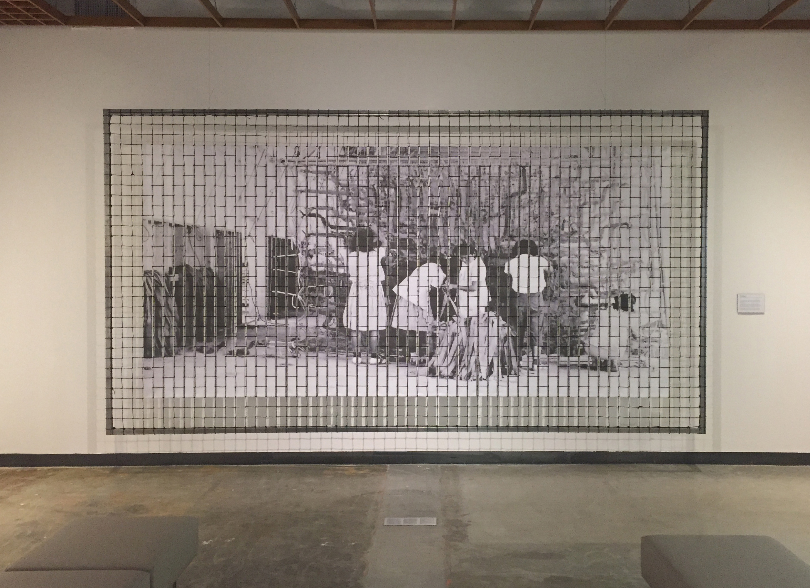 Camouflage Makers: The installation consisted of an enlarged photograph by Dorothea Lange taken at the Internment camp at Manzanar, California. Japanese Americans imprisoned there made camouflage nets for the US military in violation of the Geneva Convention. The work was first created in 1993 for a dance performance by Yuki Shiroma and exhibited again in 2007 at the Icehouse in Phoenix. (See