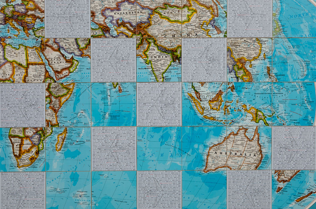 Large Detail. The tiles are made of images printed on paper and drymounted on 1/4 inch foamcore and adhered directly to the wall.